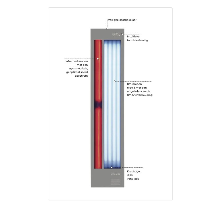 Naast infrarood beschikt deze douche over UV-type 3 lampen met een uitgebalanceerde UV-A/UV-B verhouding. Bij verantwoord gebruik: