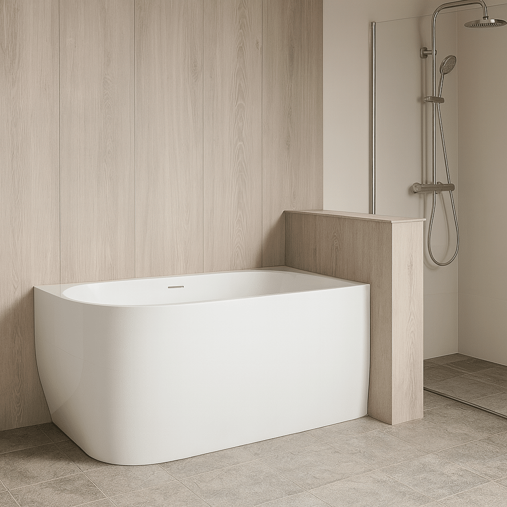 Met zijn royale formaat is dit bad ideaal voor wie écht wil genieten, zónder dat de indeling van de badkamer in de weg zit. De half vrijstaande rechterplaatsing maakt het mogelijk om het bad strak tegen een wand te zetten, waardoor je ruimte wint, maar wel die spa vibe behoudt. Combineer het bad met een vrijstaande badkraan of een minimalistische inbouwoplossing voor een strak geheel.